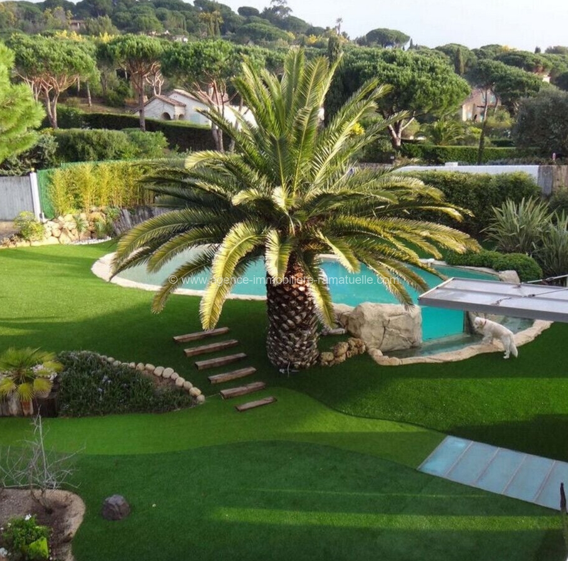 Le jardin donne accès au parking de l’Escalet où se trouvent 3 tennis et à la plage. La maison est