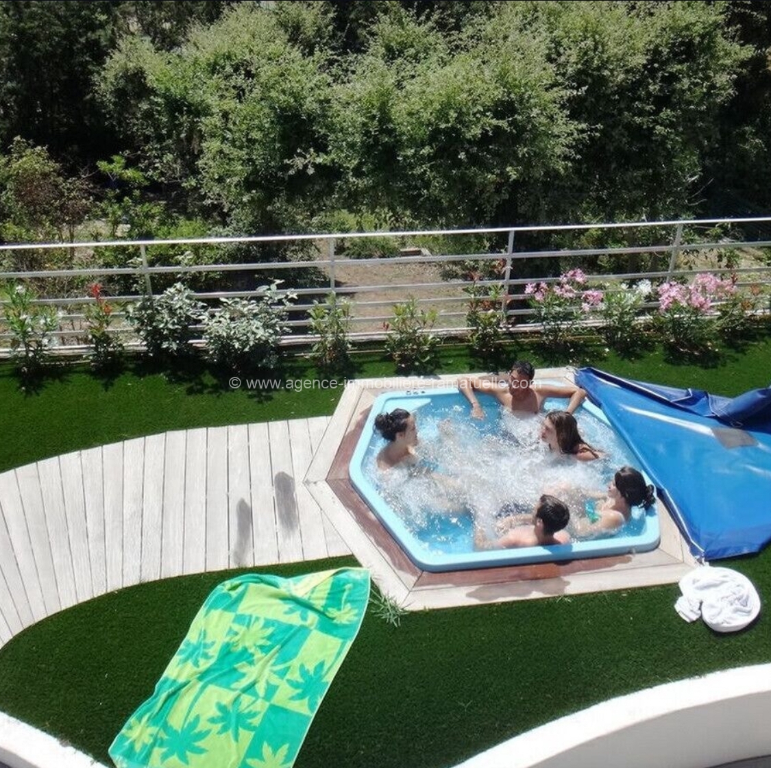 Jacuzzi dessert 2 grandes chambres, 2 SDB, une chambre d’enfants et une buanderie.