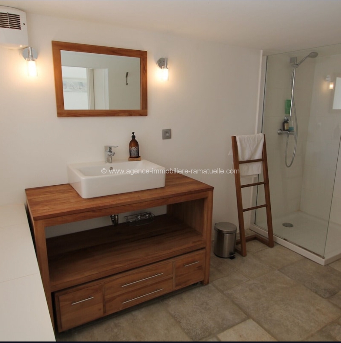Niveau inférieur : D’un côté de la maison, on trouve une grande chambre indépendante et sa SDB